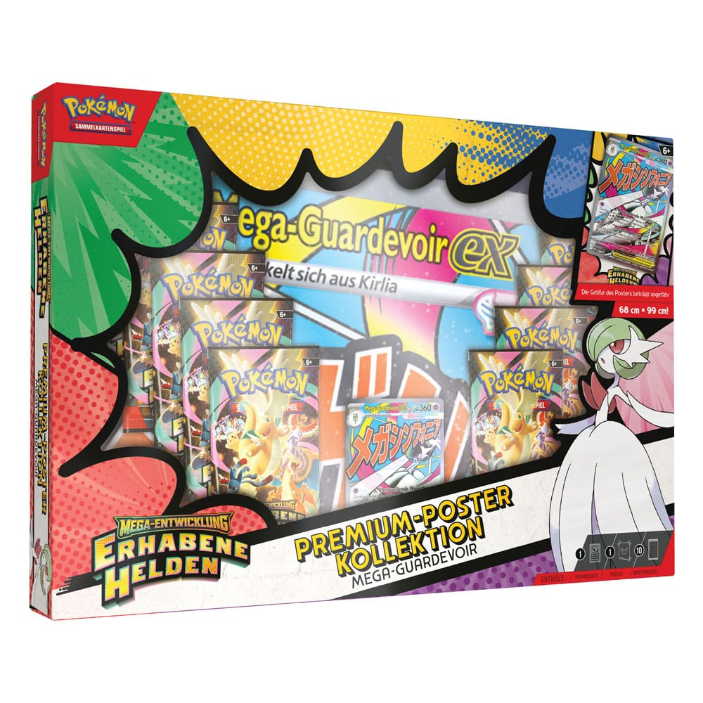 Mit starken Attacken und hohen KP sind Mega-Guardevoir-ex bzw. Mega-Lucario-ex im Kampf keine Grenzen gesetzt! Verbünde dich mit diesem mächtigen Mega-Entwicklungs-Pokémon-ex, das dich hier als holografische Vollbild-Promokarte erwartet, und entdecke danach noch mehr Pokémon in den 10 enthaltenen Boosterpacks der Erweiterung Mega-Entwicklung - Erhabene Helden. Du erhältst außerdem ein großes Poster mit Mega-Guardevoir bzw. Mega-Lucario und anderen Pokémon aus dieser besonderen Erweiterung.